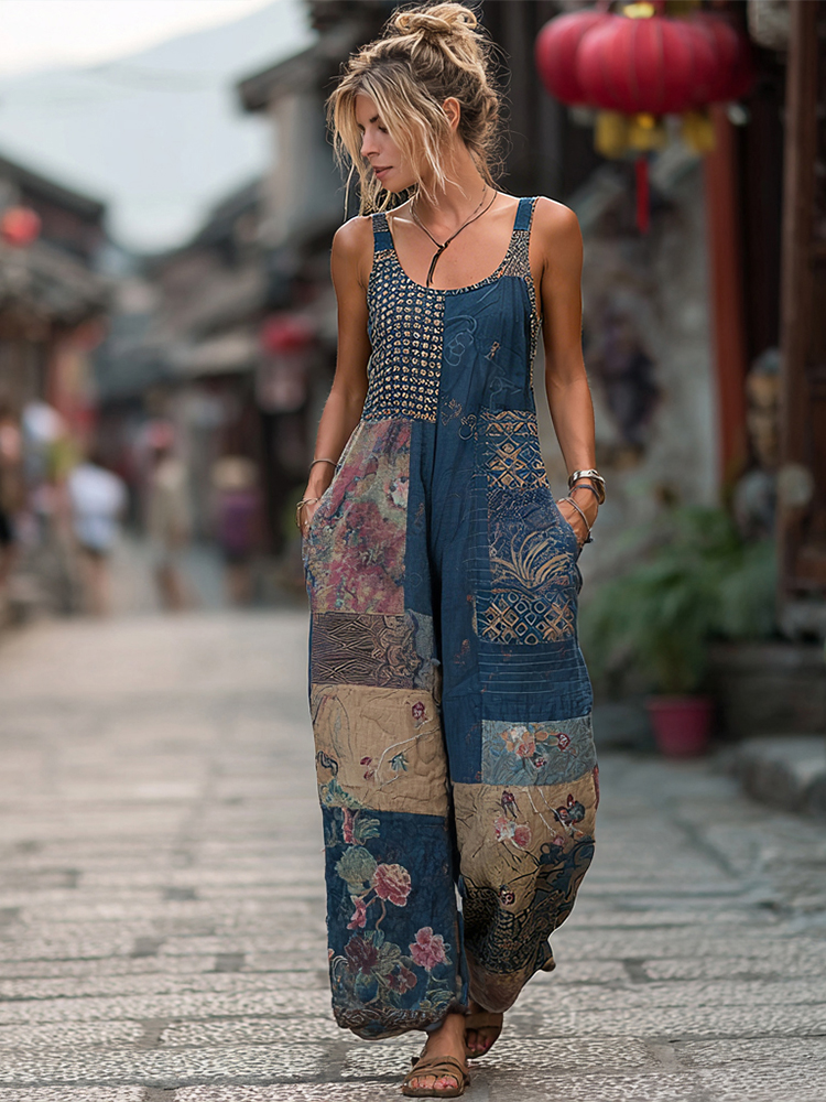 Women's Japanese-style Floral Linen Sleeveless Jumpsuit