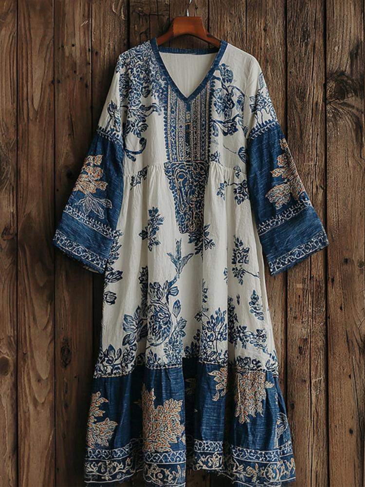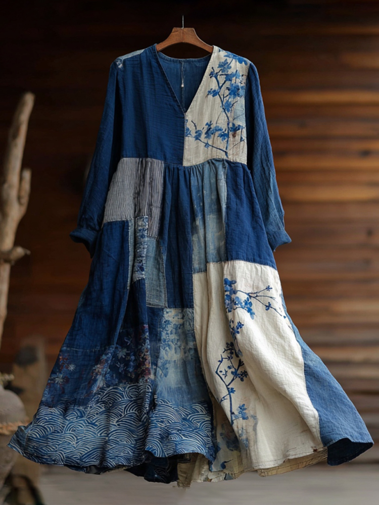 Japanese Art Retro Style Plant And Flower Pattern Patchwork Design V-neck Cotton And Linen Dress