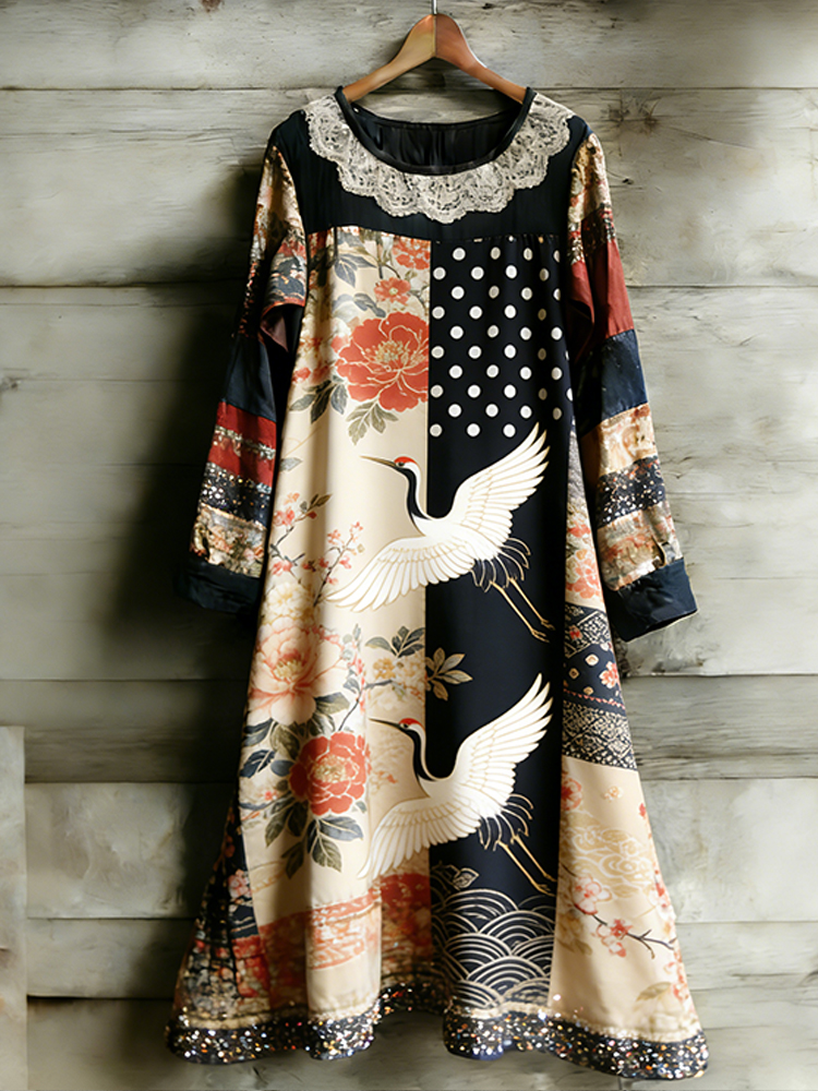 Women's Vintage Floral Flying Crane Lace Round Neck Dress