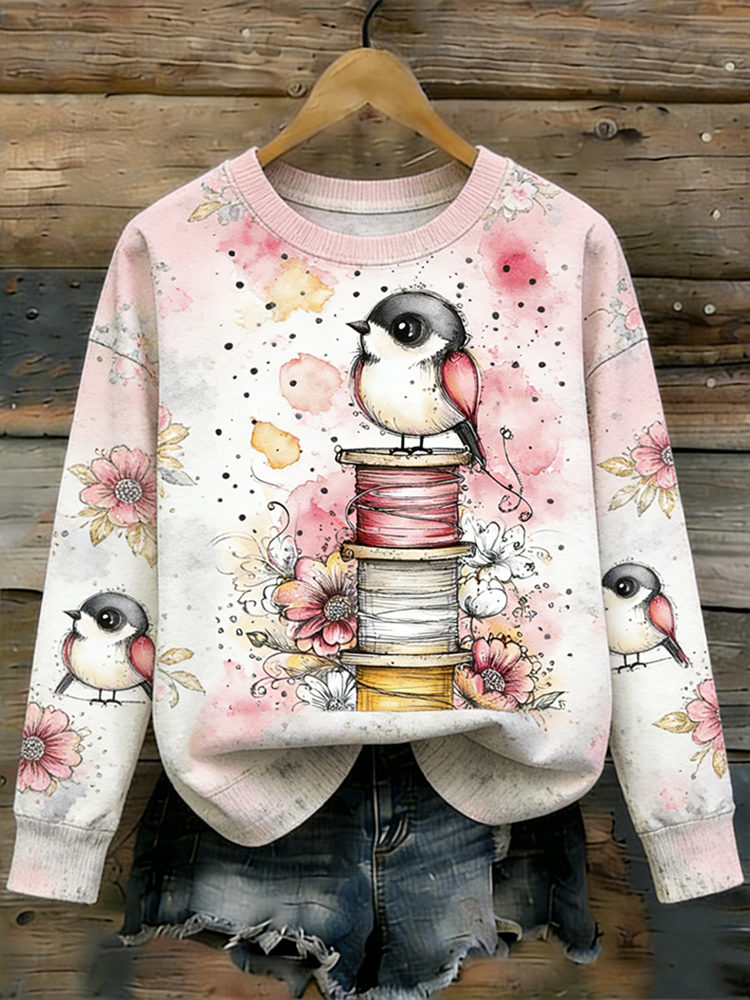 Retro Line Art Cute Animal Print Casual Long-sleeve T-shirt