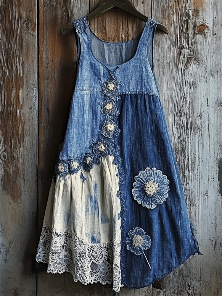 Floral Denim Textile Lace Hem Patchwork Tank Dress