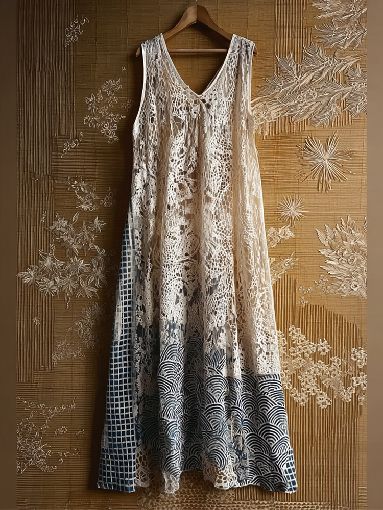 Japanese Waves Patchwork Hollow Lace Maxi Tank Dress