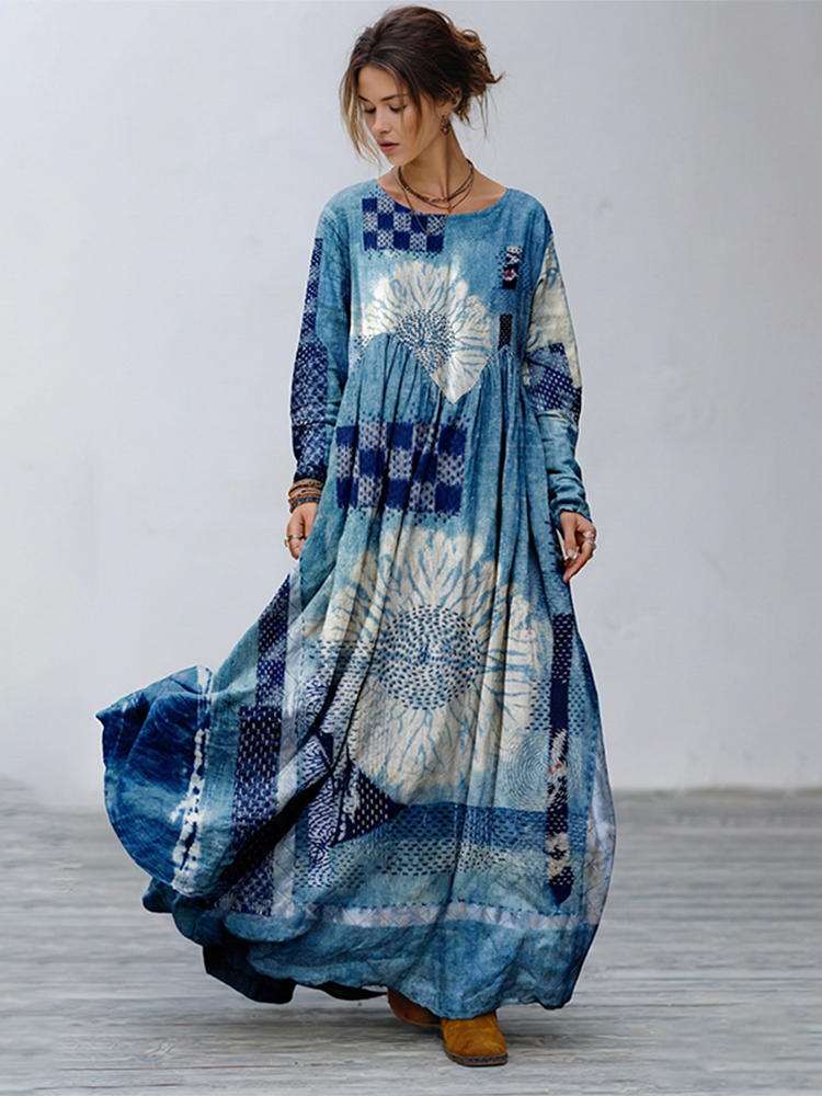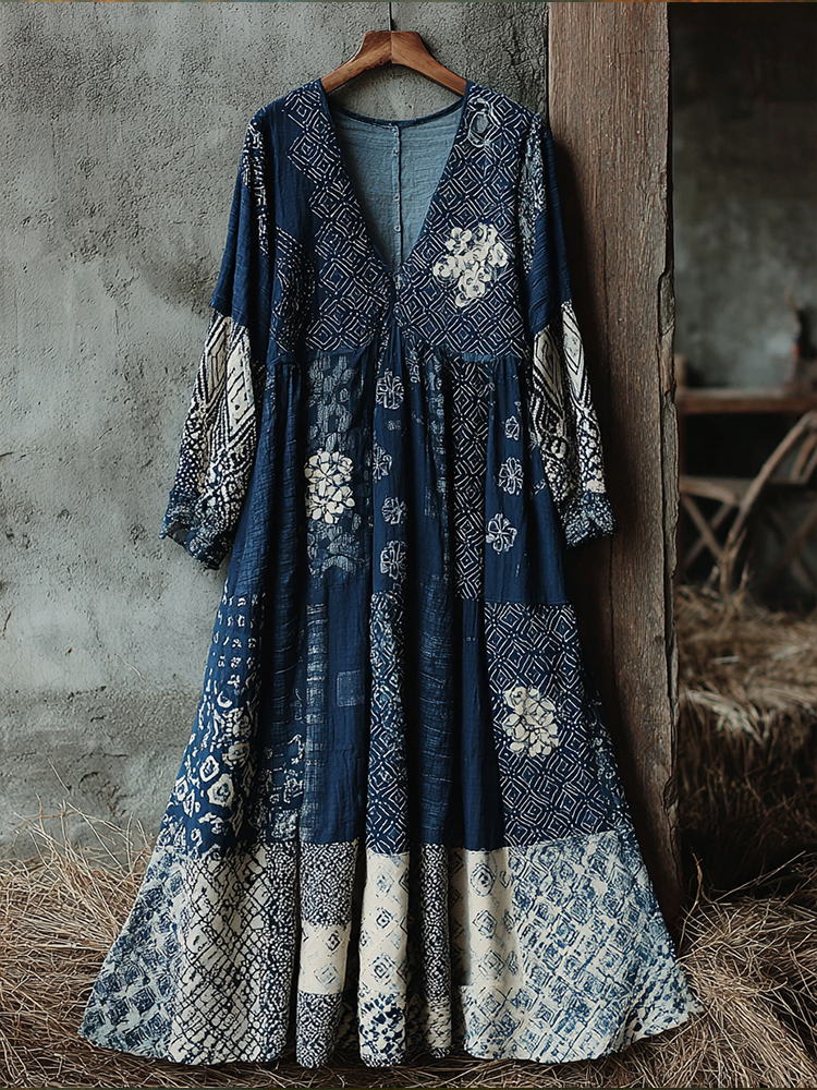 Women's Traditional Japanese Sashiko Art V-neck Dress