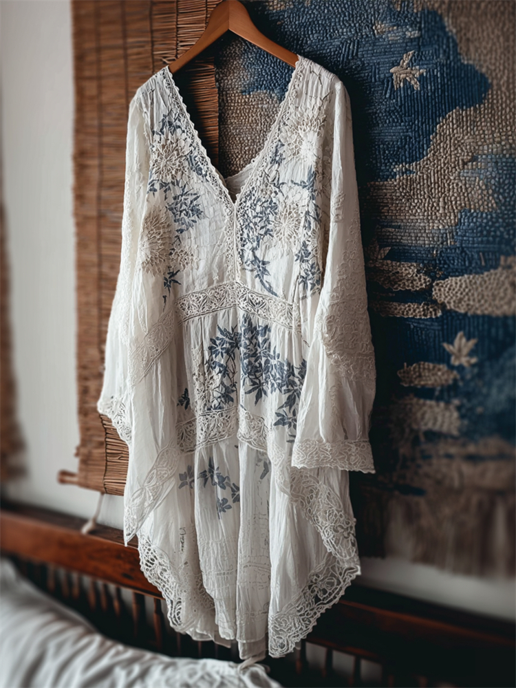 Japanese Floral Sashiko Embroidered Lace Flowy Linen Tunic