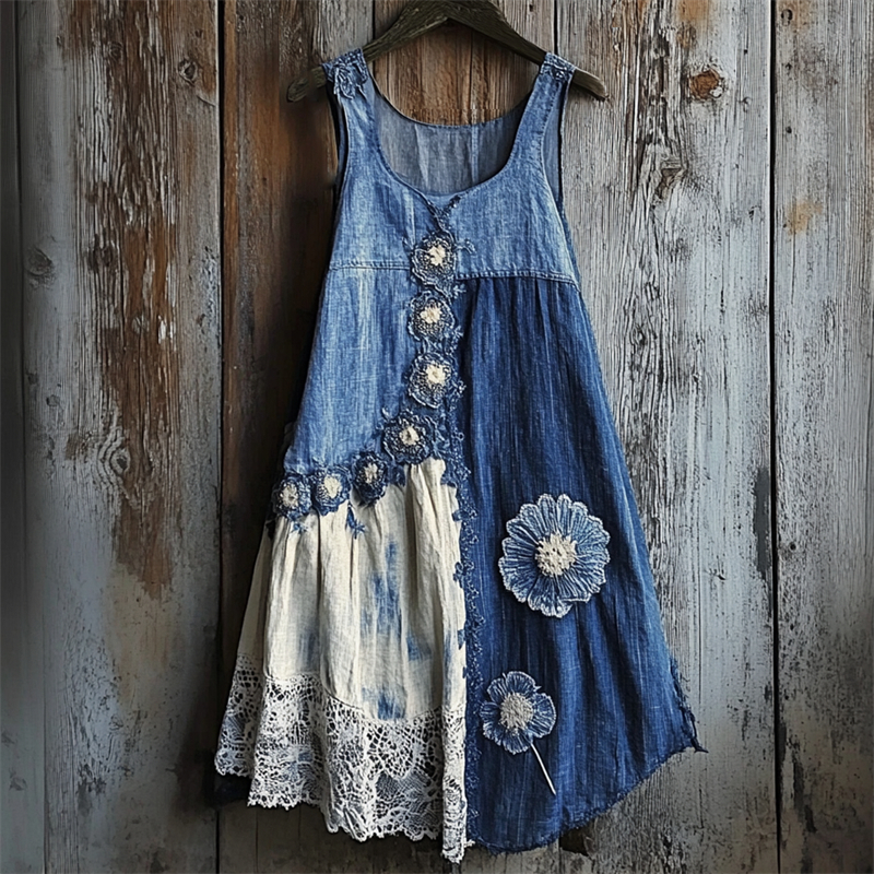 Floral Denim Textile Lace Hem Patchwork Tank Dress