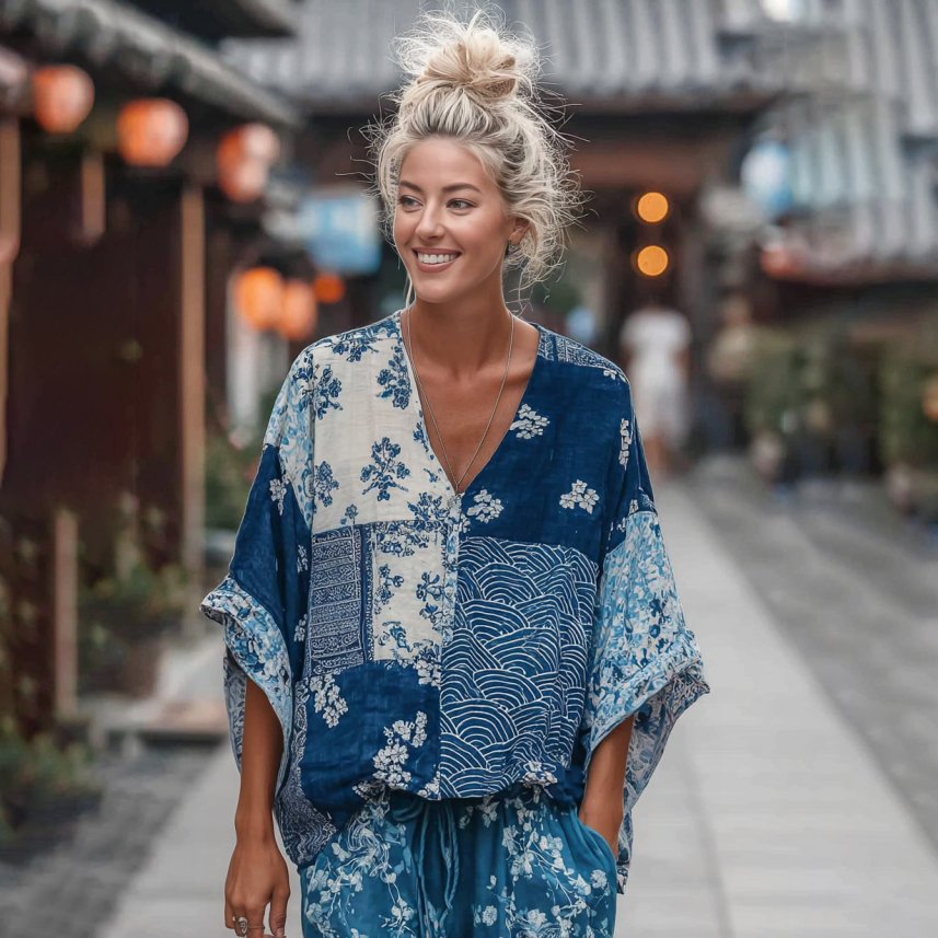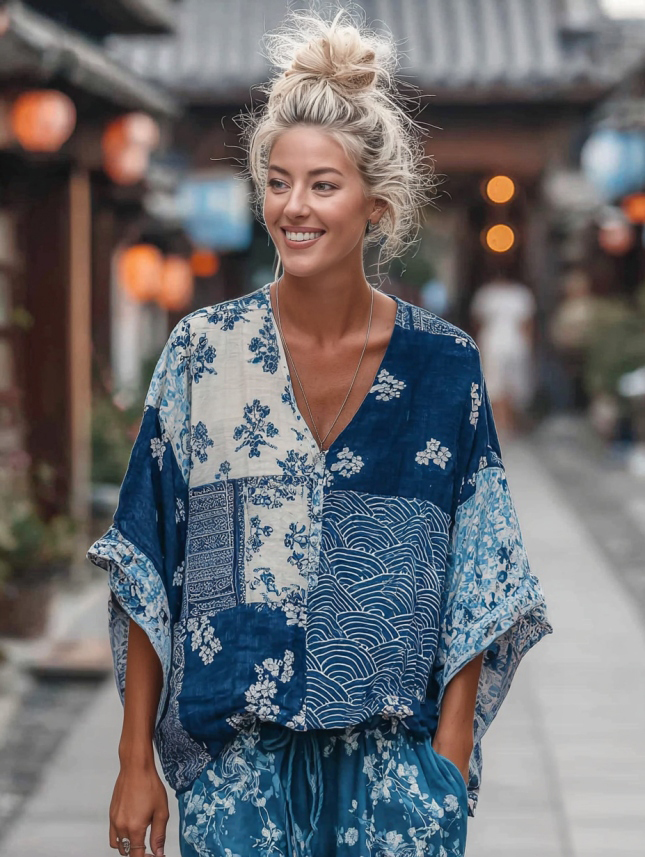 Women's Vintage Japanese Traditional Sashiko And Wave Patchwork Art Print Linen Tops