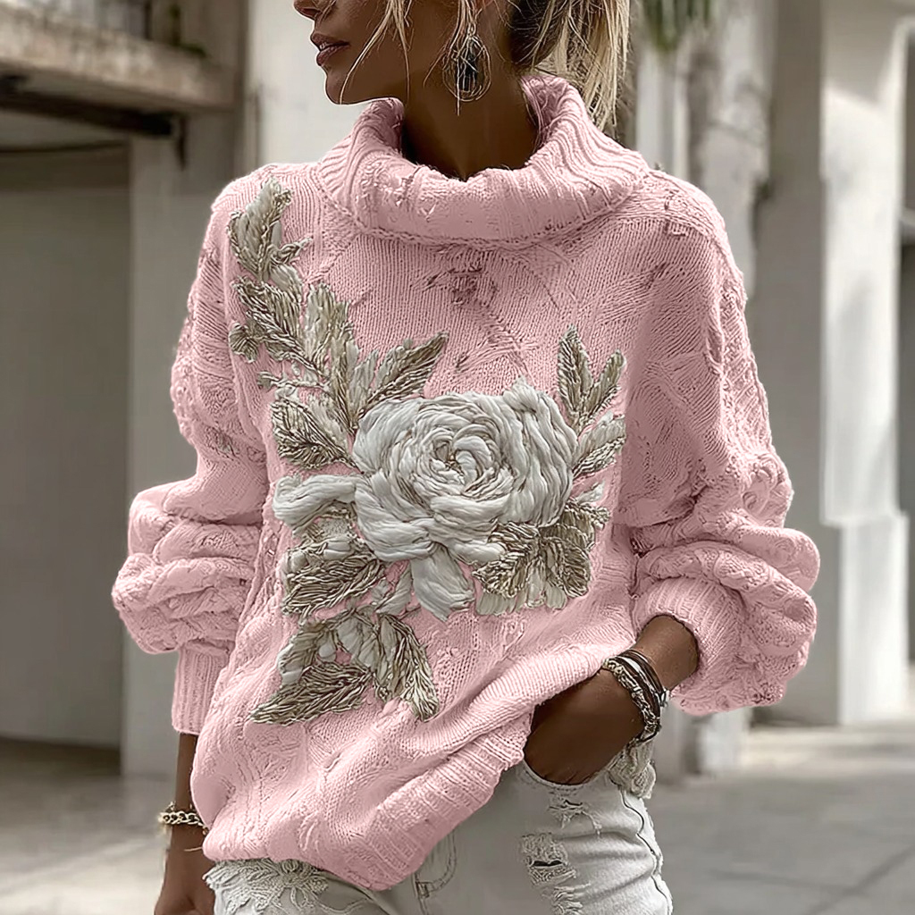 Women's Vintage White Rose Chunky Knit Turtleneck Sweater