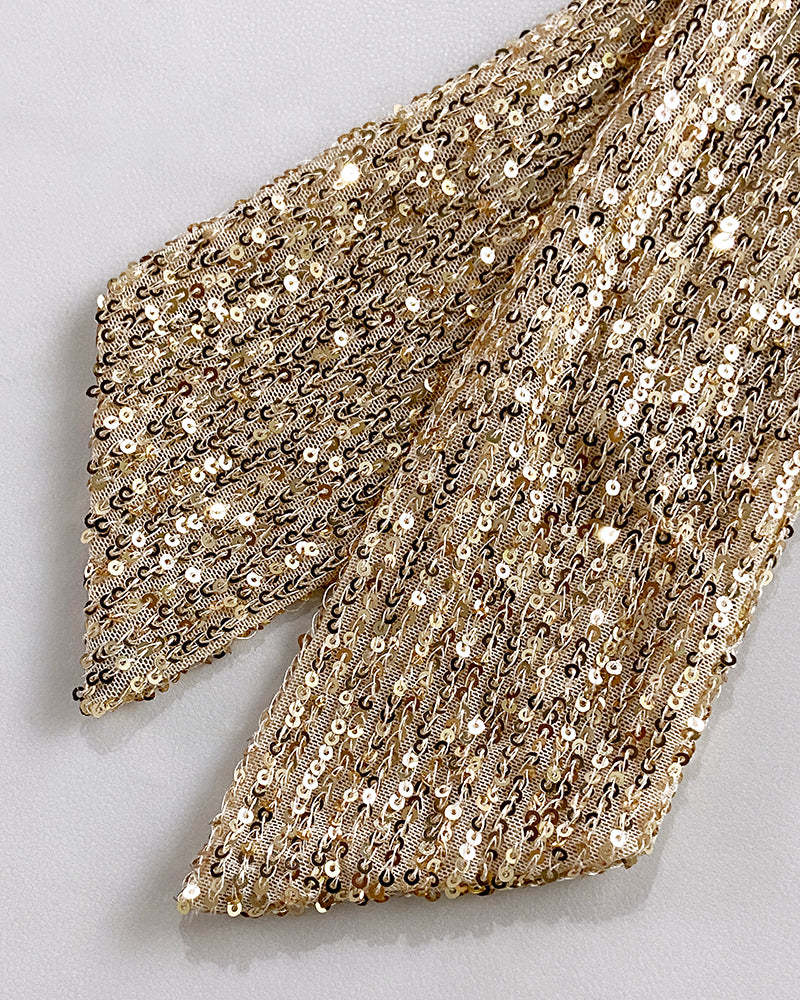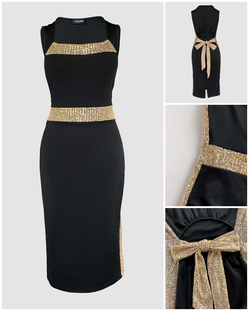 Design Details: A square neckline sets a structured frame, paired with a hollow-out back and a sequin bow-tie detail for visual impact. Gold contrast sequins highlight the side and front, enhancing the dress’s refined yet statement-making design.