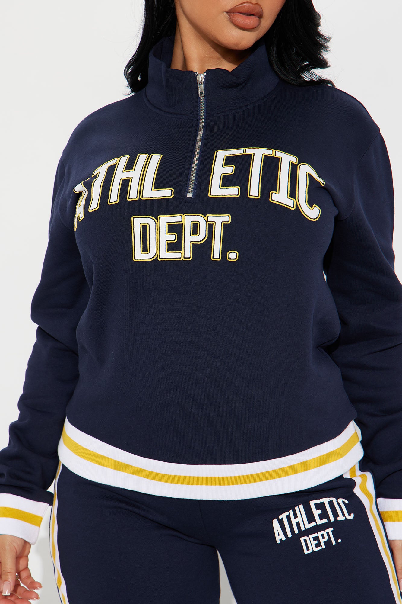 Available In Navy.Fleece Pant SetPullover SweatshirtQuarter Zip UpAthletic Dept. GraphicStripe DetailWide Leg PantDisclaimer: Due To The Screen Printing Process A Difference In Saturation May Occur. Each Garment Is Unique.100% CottonImported