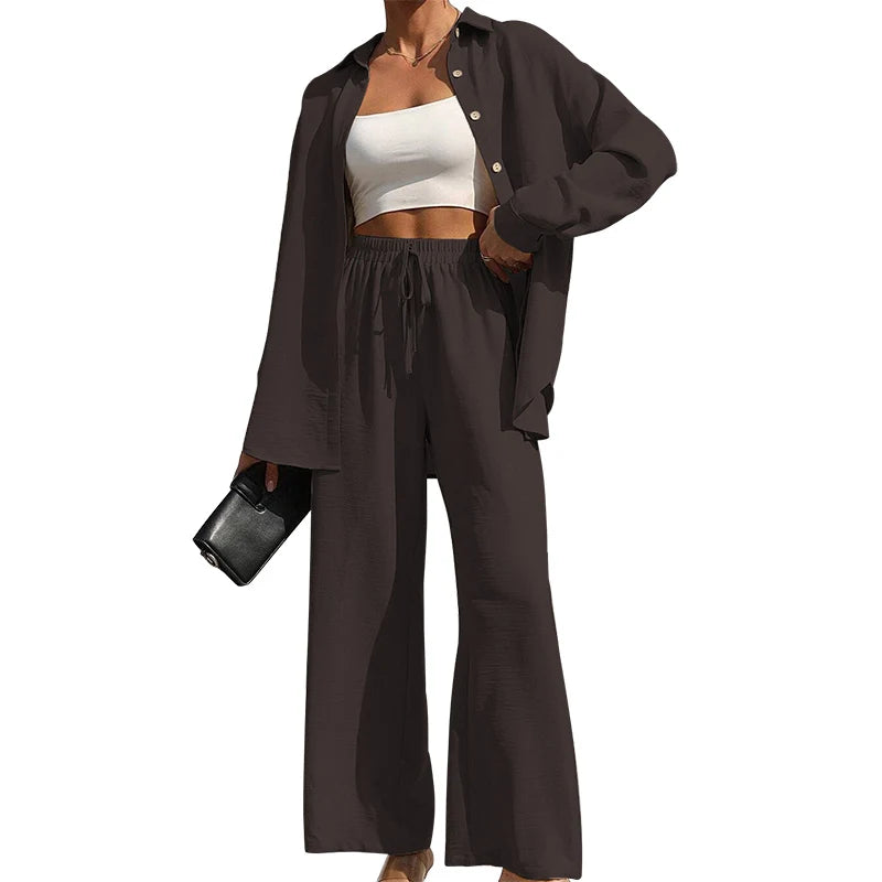 Women's Solid Button Front Collared Shirt & Tie Front Wide Leg Pants Two-piece Set, Casual Drop Shoulder Long Sleeve Top & Trousers 2 Piece Set for Spring & Fall, Women's Clothes for Daily Wear