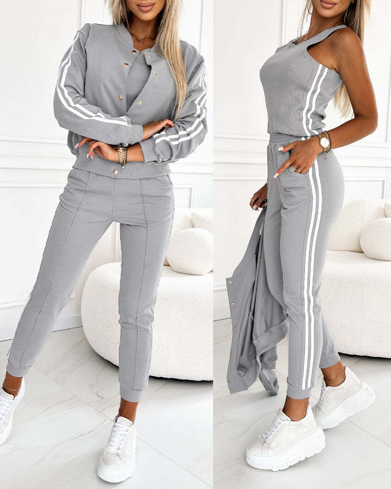 Design Details – Snap-button front coat with contrast side stripes, thick-strapped tank top, and slim pants featuring elastic waist and stretchy cuffs for added comfort; pants include functional pockets.