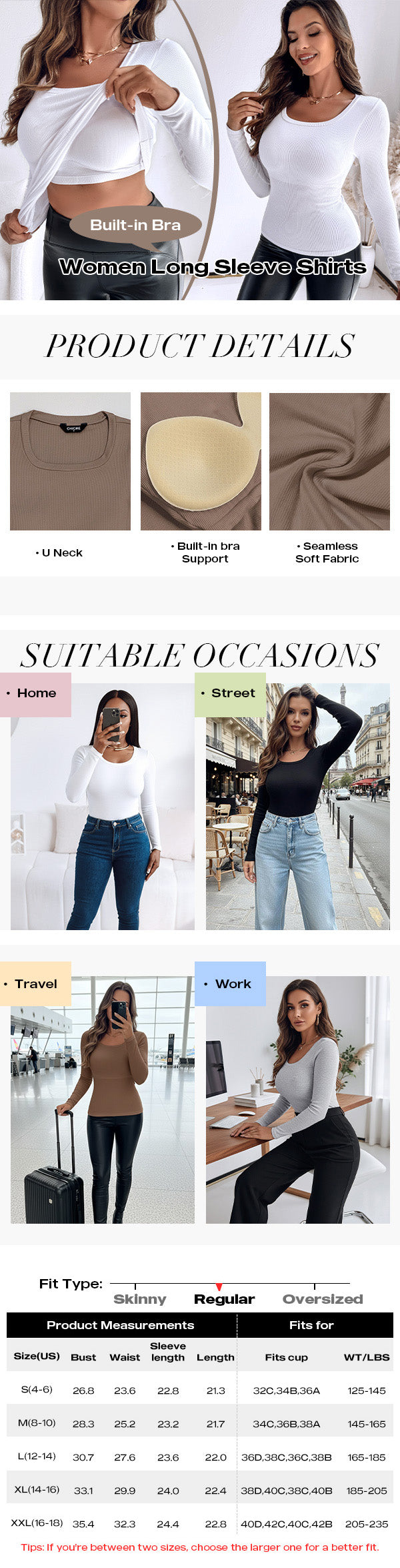 Design Details: Built-in light padding for a smooth, natural look without the need for a separate bra, offering all-day comfort and ease.
