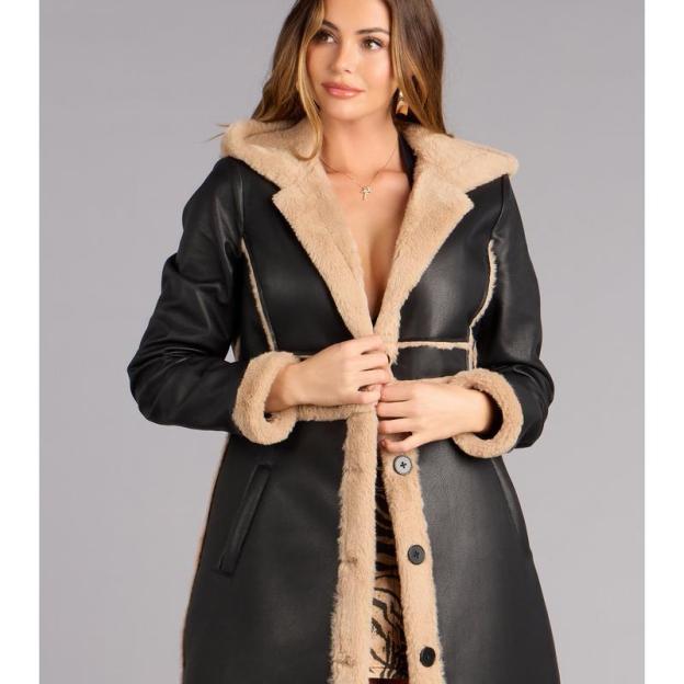 A coat that works harder than half your closet—this convertible trench coat snaps from polished longline drama into a cropped jacket the second you feel like switching the vibe.Fit & Features·Faux leather fabric, soft faux fur lining·Lapel collar hooded neckline·Long sleeves, faux fur cuffs·Button-down front closures, side pockets·Detachable design for two-way wear·Longline hem·Runs true to size