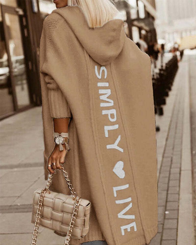 Letter Heart Pattern Long Cardigans Knitted Open Front Oversized Hooded Outerwear Sweater Coat