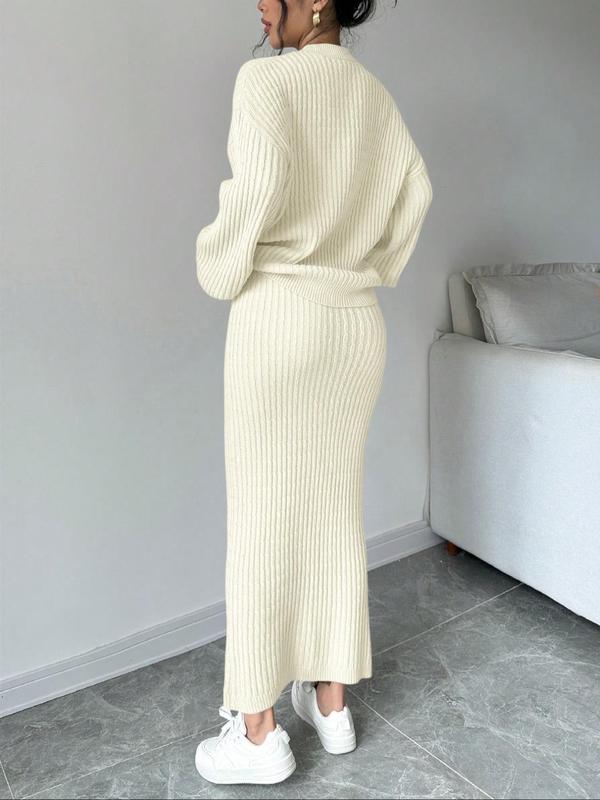 Women's Solid Button Front Sweater & Long Skirt Two-piece Set, Casual Drop Shoulder Long Sleeve Knit Top & High Waist Skirt for Daily Outdoor Wear, Women's Knitwear for Fall & Winter