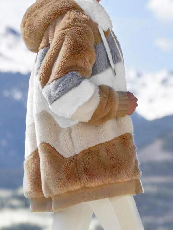 Women's Colorblock Drop Shoulder Hooded Polar Fleece Coat, Fashion Casual Long Sleeve Zip Up Warm Outerwear For Daily Outdoor Wear, Women's Clothing, Jackets